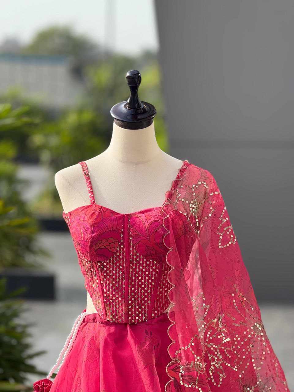 Lehenga – Pure organza digital printed lehenga with a grand 8-meter flair, featuring canvas patta, can-can, and adjustable waist dori